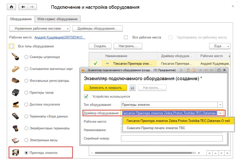 • В типе оборудования выделите пункт «Принтеры этикеток».
