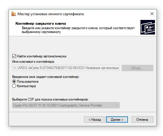 6. Поставьте галку в окне Найти контейнер автоматически (в нашем примере контейнер находится на смарт-карте JaCarta) и нажмите Далее: