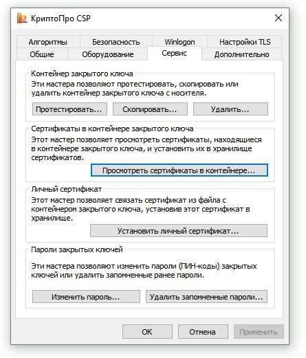 2. В окне программы КриптоПро CSP перейдите на вкладку Сервис и нажмите кнопку Просмотреть сертификаты в контейнере: