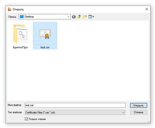 4. Укажите путь к файлу сертификата и нажмите кнопку Открыть (в нашем примере файл сертификата находится на Рабочем столе):