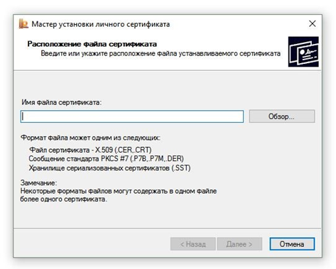 Для установки сертификата этим способом Вам понадобится файл сертификата (файл с расширением.cer). Он может находиться, например, на съемном носителе или на жёстком диске компьютера (если Вы делали копию сертификата или Вам присылали его по электронной почте).
